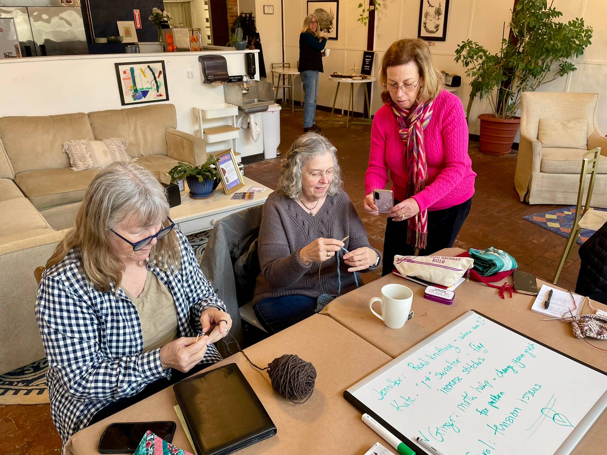 Teacher Mary Prassinos (center) guided us through knitting tips and tricks including: how to read your knitting, increasing stitches for sweaters, math help for selecting the right yarn for your project, and tensioning issues. The group decided to make this a recurring monthly event!