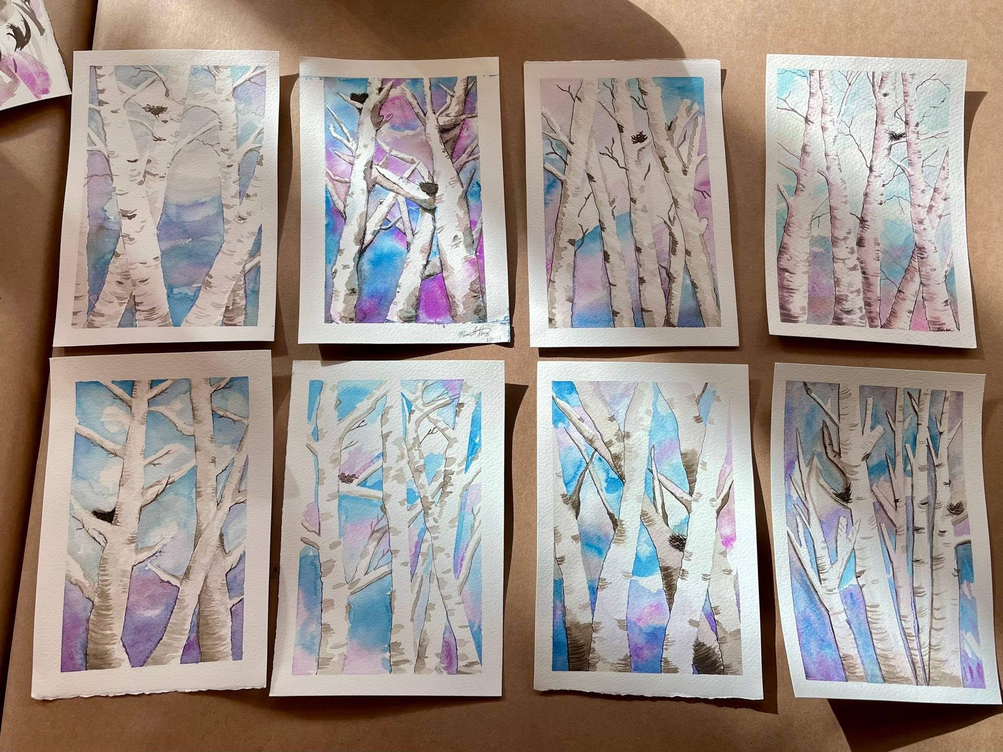 Student work from last weekend's Aspen Trees in Winter watercolor + mixed media workshop.
